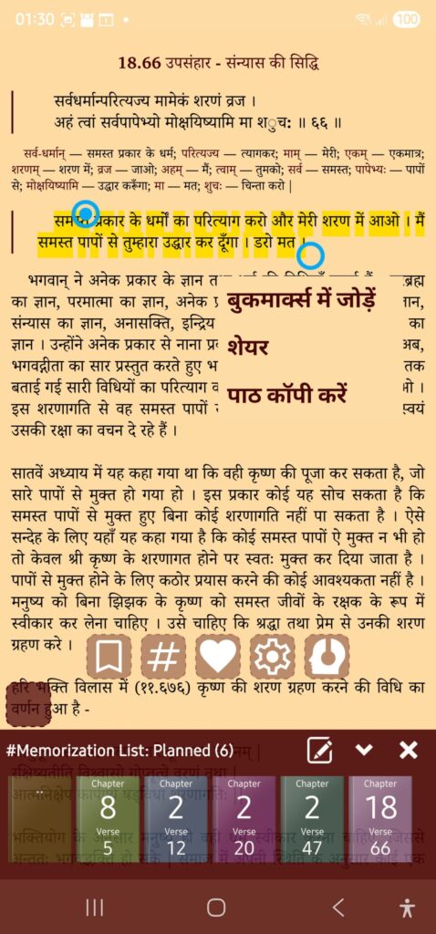 - list of “Bookmarks” (i.e. named notes on shlokas)
